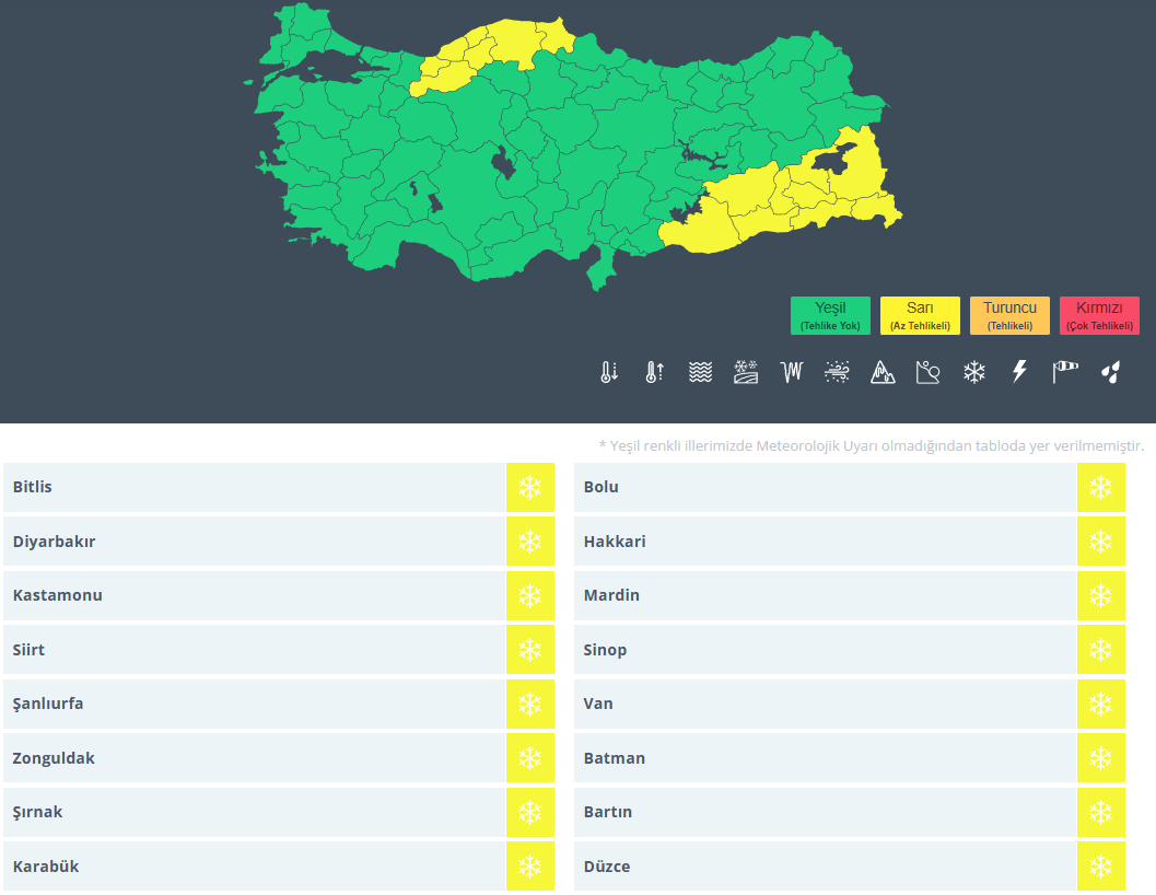 Bitlis, Bolu, Diyarbakır, Hakkari, Kastamonu, Mardin, Siirt, Sinop, Şanlıurfa, Van, Zonguldak, Batman, Şırnak, Bartın, Karabük, Düzce için sarı kod uyarısı verildi.